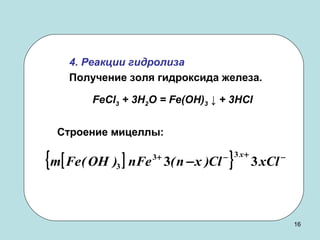 Гидрозоль гидроксида железа синтезируют методом конденсации путем проведения реакции гидролиза хлорида железа при 100ºС: