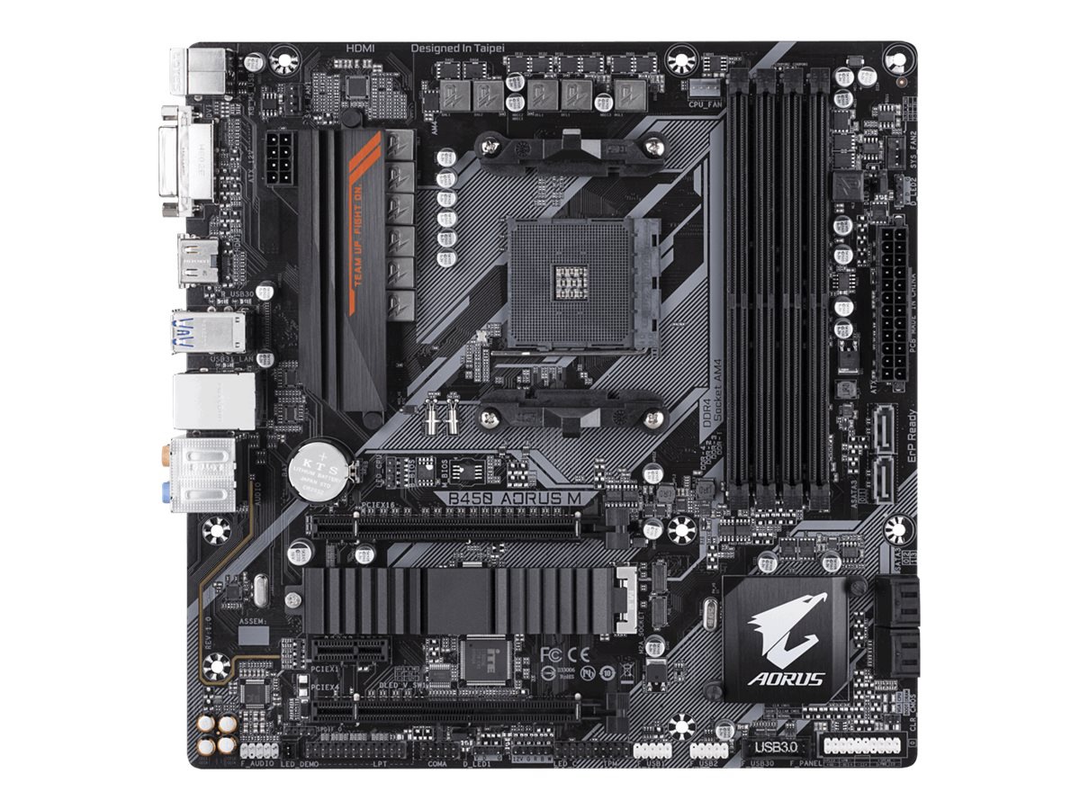 AMD B450 AORUS Motherboard with Hybrid Digital PWM, Dual M .2 with One Thermal Guard, RGB FUSION 2 .0, GIGABYTE Gaming LAN with Bandwidth Management, CEC 2019 ready Supports AMD Ryzen™ 5000 series / Ryzen™ 5000 G-Series/ 3rd Gen Ryzen™/ 2nd Gen Ryzen™/ 1st Gen Ryzen™/ 2nd Gen Ryzen™ with Radeon™ Vega Graphics/ 1st Gen Ryzen™ with Radeon™ Vega Graphics/ Athlon™ with Radeon™ Vega Graphics Processors Dual Channel Non-ECC Unbuffered DDR4, 4 DIMMs HDMI, DVI-D Ports for . . .