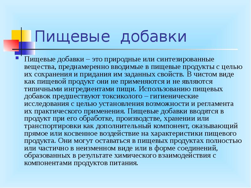 Гигиенические проблемы применения и использования пищевых добавок . ⇐ Предыдущая Стр 6 из 7 Следующая ⇒ . Современное питание связано с широким использованием пищевых добавок (слайд №122) - веществ, преднамеренно вносимых в пищевые продукты в небольших количествах с . . .