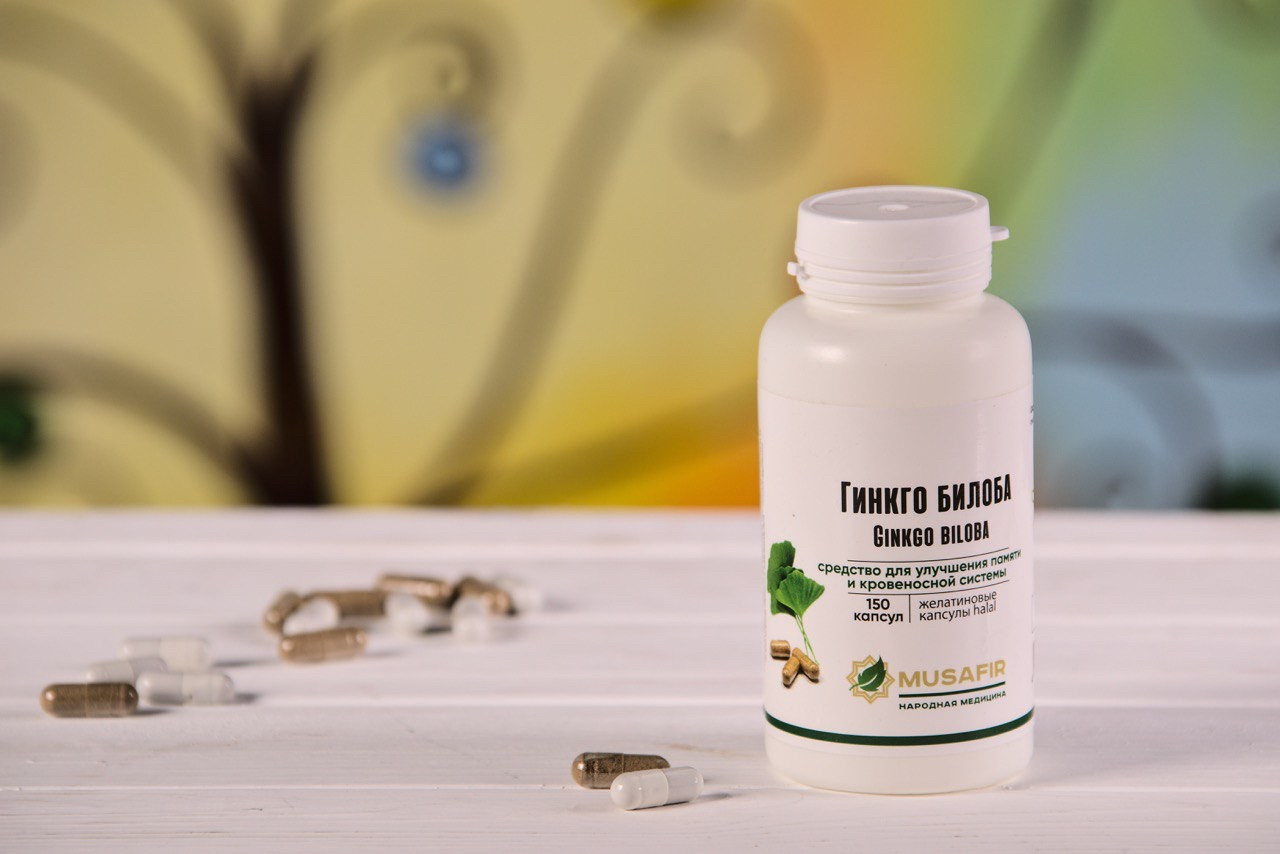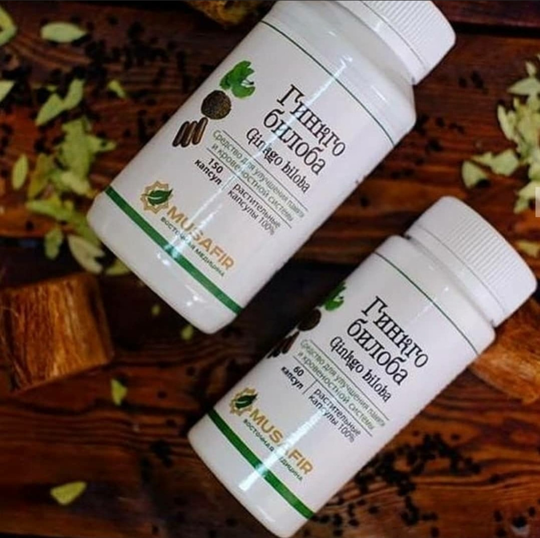 Гинкго билоба Мусафир — это капсулы известного растения гингко . Для улучшения памяти и кровеносной системы . Для удобства в капсулах . Показания к применению Во-первых, расширяет просвет артерий, вен и капилляров . Во-вторых, уменьшает вязкость крови, в-третьих, предотвращает образование тромбов . Улучшает кровоток в головной мозг .