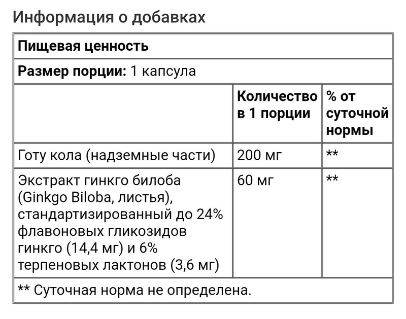 Содержание (суточная дозировка - 2 капсулы): экстракт гинкго билоба 120 мг, dha-содержащий рафинированный рыбий жир (dha 80 мг) 200 мг, ГАМК (γ-аминомасляная кислота) 20 мг, ps (фосфатидилсерин) 10 мг, витамин b1 2 мг, витамин b6 2 мг . . .