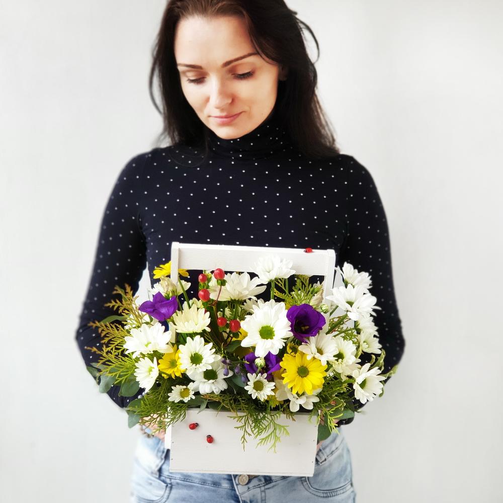 Купить букет из белых хризантем, гиперикума и зелени с бесплатной круглосуточной доставкой по Смоленску в магазине «Машенька» . Заказать букет по низкой цене . Индивидуальный подход, скидки постоянным клиентам