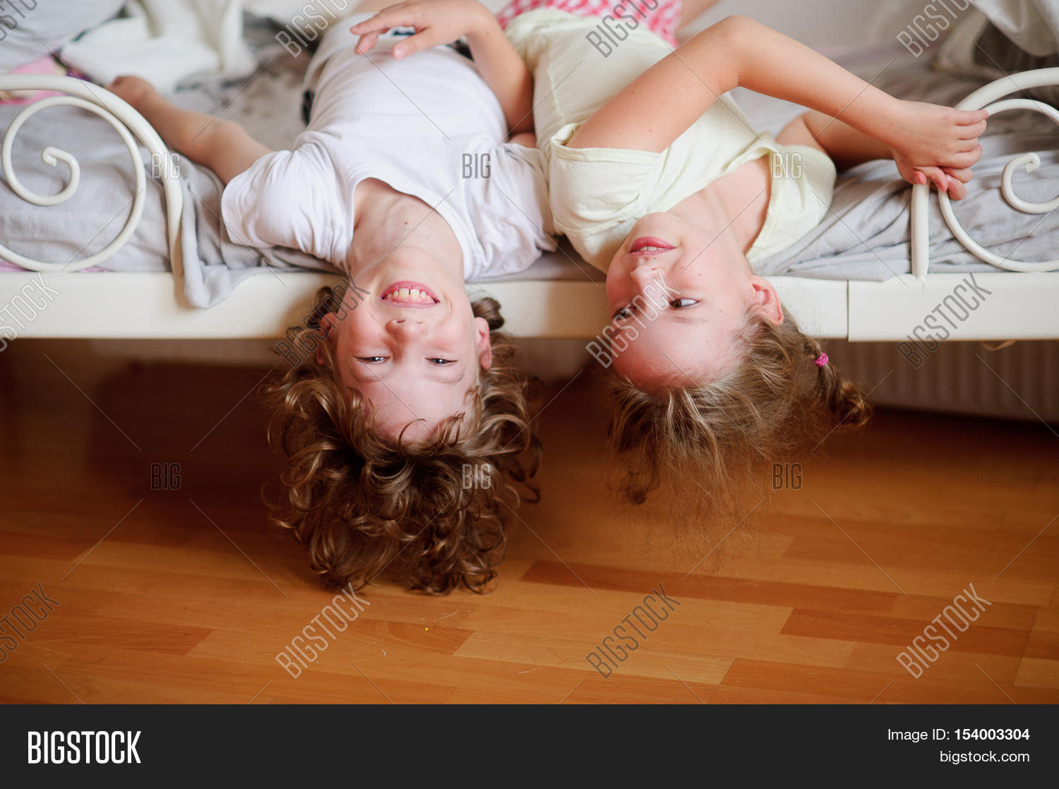 The children, boy and girl, naughty on the bed in the bedroom. They lie side by side, their heads hanging off the bed. Children is very amused