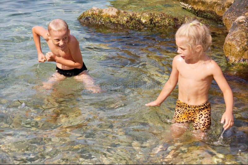 Naughty boy and girl playing in water. (focus on boy). Shot in the Cape Aia Nature Reserve, near Balaklava/Sevastopol, Crimea peninsula, Black Sea, Ukraine