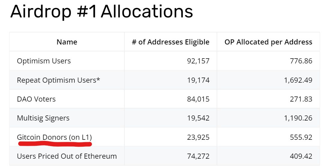 پروژههای دیگر نیز به دونیتکنندگان گیتکوین جوایزی اختصاص میدهند. برای مثال، Optimism تعداد 555 توکن $OP را به آدرس هایی که دونیت کرده بودند (L1) اختصاص داد.