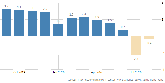 ⬛Потребительские цены в Гонконге упали на 0,4 процента в годовом исчислении в августе 2020 года после падения на 2,3 процента в предыдущем месяце. Это было второе последовательное снижение потребительских цен, хотя и более медленными темпами, поскольку в августе исчезли последствия выплаты правительством арендной платы за государственное жилье и отказа от двух третей арендной платы арендаторам жилых комплексов группы B Жилищным обществом Гонконга в июле. . Стоимость жилья подскочила (0,6% против -4,8% в июле); при этом цены на транспорт снизились меньше (-2,4% против -3,7%). Кроме того, более быстрыми темпами росла стоимость различных товаров (2,9% против 2,3%); и услуги (0,7% против 0,6%). Напротив, цены на продукты питания снизились (0,5% против 0,8%), в том числе продукты, купленные вне дома (-1,3% против -1,1%); стоимость электроэнергии, газа и воды снизилась (-19,3% против -18,6%); товары длительного пользования (-4,2% против -3,2%) и одежда и обувь (-7. 6% против -4,7%). В месячном исчислении потребительские цены выросли на 2 процента.