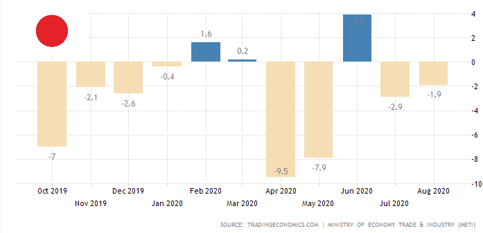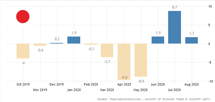 $JPY Промышленное производство Японии выросло на 1,7 процента по сравнению с предыдущим месяцем в августе 2020 года, снизившись с 8,7 процента в июле, но немного превзойдя ожидания рынка в 1,5 процента, показала предварительная оценка. Наибольший вклад в этот рост внесло производство автомобилей (8,9% против 38,4%), за ними следовали чугун, сталь и цветные металлы (6,5% против 11,3%), а также электронные детали и устройства (4,6%, как и в июле). В то же время сокращение наблюдалось в производственном машиностроении (-9,8% против -4,6%), электротехническом оборудовании и информационно-коммуникационном электронном оборудовании (-3,7% против 4,5%) и целлюлозно-бумажной и бумажной продукции (-3,3% против 10,1%).