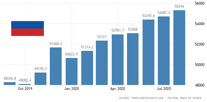 $RUB Денежная масса M2 в России увеличилась до 55294 млрд рублей в августе с 54687,40 млрд рублей в июле 2020 года.