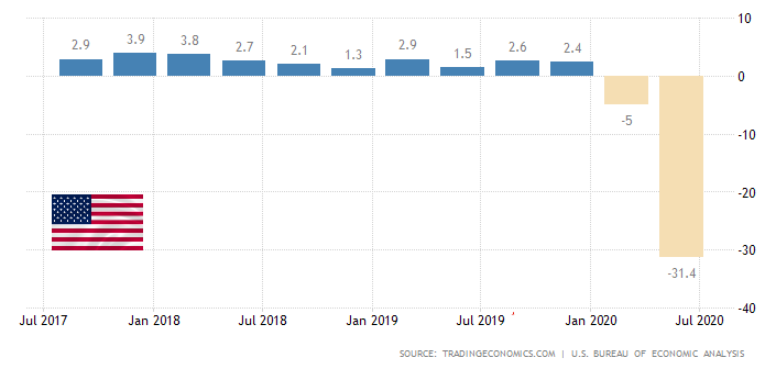 $USD Экономика США сократилась на 31,4 процента в годовом исчислении во втором квартале 2020 года, что немного меньше, чем падение на 31,7 процента по второй оценке и 32,9 процента по предварительной оценке. Он отражает в основном пересмотр в сторону увеличения расходов на личное потребление (PCE), который был частично компенсирован пересмотром в сторону уменьшения экспорта и инвестиций в основной капитал нежилого сектора. Тем не менее, это остается самым большим спадом за всю историю, толкающим экономику в рецессию, поскольку пандемия коронавируса вынудила закрыть многие предприятия, включая рестораны, кафе, магазины и фабрики, а людей остаться дома, что нанесло ущерб потребительским и бизнес-расходам.
