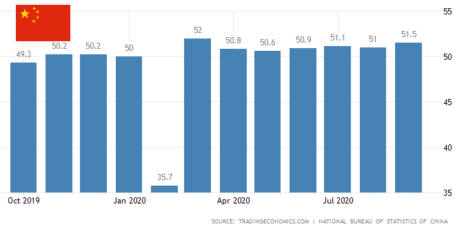 $CNH Официальный индекс деловой активности в производственной сфере Китая от NBS вырос до 51,5 в сентябре 2020 года с 51 в предыдущем месяце, что выше ожиданий рынка в 51,2. Это был седьмой месяц подряд роста производственной активности и самый сильный с марта, поскольку экономика продолжала восстанавливаться после шока COVID-19. Произошел рост производства (54,0 против 53,5 в августе), новых заказов (52,8 против 52,0) и экспортных продаж (50,8 против 49,1). При этом занятость упала меньше (49,6 против 49,4). При этом сроки поставки у поставщиков немного увеличились (50,7 против 50,4). Что касается цен, то производственные затраты увеличивались пятый месяц подряд (58,5 против 58,3), тогда как отпускные цены росли четвертый месяц подряд, но более медленными темпами (52,5 против 53,2). В перспективе настроения деловых кругов практически не изменились (58,7 против 58,6).