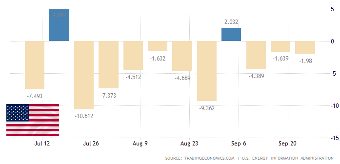 🛢Согласно отчету EIA, запасы сырой нефти в США упали на 1,980 миллиона баррелей за неделю, закончившуюся 25 сентября 2020 года, третью неделю подряд снижения и по сравнению с рыночными ожиданиями роста на 1,569 миллиона баррелей. Между тем, запасы бензина выросли на 0,683 миллиона баррелей, тогда как рынки прогнозировали падение на 1,083 миллиона баррелей.