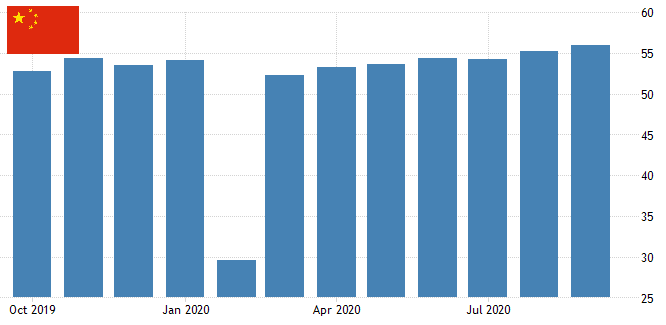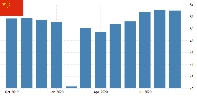 $CNH Индекс деловой активности в производственном секторе Китая Caixin составил 53,0 в сентябре 2020 года по сравнению с консенсусом рынка и августовским значением 53,1, что указывает на то, что производственная деятельность сохранила темпы восстановления после эпидемии COVID-19. Новые заказы выросли больше всего с начала 2011 года, новые экспортные операции росли самыми высокими темпами с августа 2017 года, а объем производства продолжал расти. Кроме того, производители снова повысили свою покупательную активность, причем самыми быстрыми темпами с января 2011 года. В то же время уровень занятости стабилизировался, положив конец восьмимесячному периоду сокращения рабочих мест. Что касается цен, фирмы сообщили о дальнейшем заметном увеличении производственных затрат, но лишь незначительно повысили свои отпускные цены. Заглядывая вперед, настроение улучшилось до трехмесячного максимума. "Экономическое восстановление ускорилось после эпидемии.