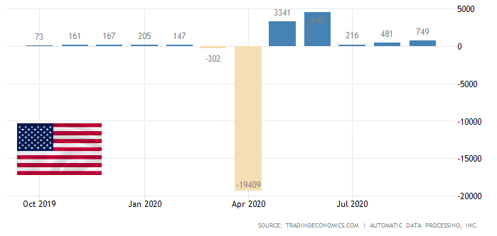 $USD Частные предприятия в США наняли 749 тыс. Рабочих в сентябре 2020 года, это максимум за три месяца и выше ожиданий рынка по росту на 650 тыс., Что вселяет надежду на усиление восстановления рынка труда. Тем не менее, только половина из почти 20 миллионов рабочих мест, потерянных с марта, когда начался кризис с коронавирусом, была восстановлена. В секторе предоставления услуг появилось 552 тыс. Рабочих мест, в основном в сфере торговли, транспорта и коммунальных услуг (186 тыс.); досуг и туризм (92К); образование и здоровье (90K); профессиональные и деловые (78K); финансовая деятельность (29K) и информация (17K). В товарном секторе добавлено 196 тыс. Рабочих мест за счет производства (130 тыс.), Строительства (60 тыс.), Природных ресурсов и горнодобывающей промышленности (7). Число рабочих мест в частных компаниях в крупных компаниях увеличилось на 297 тысяч, в компаниях среднего размера - на 259 тысяч, а в малых компаниях - на 192 тысячи.
