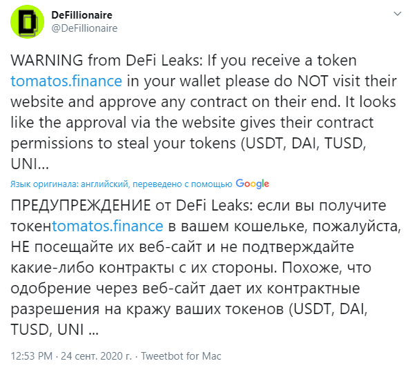 ⚫Пользователи, получившие в ходе эирдропа токены DeFi-проекта tomatos.finance, могут столкнуться с угрозой потери активов. Об этом предупреждает Telegram-канал DeFi Leaks.