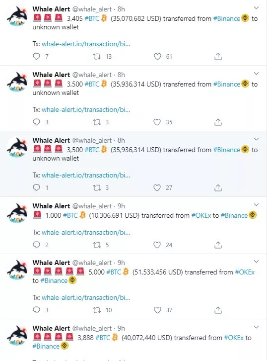 Эти переводы осуществлялись между криптовалютными биржами Binance и OKEx, а также между тремя анонимными кошельками.