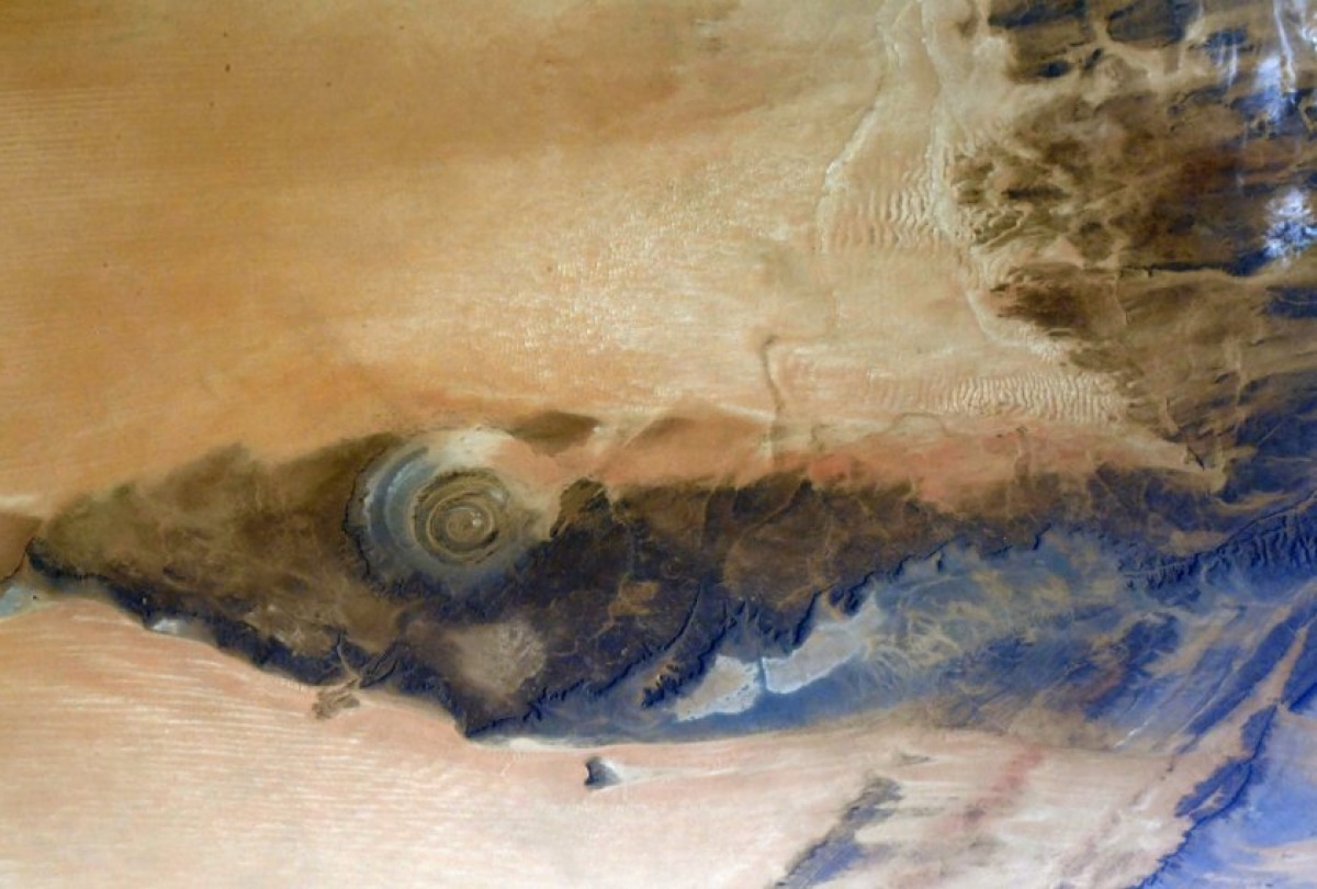 На фото Сахары из космоса хорошо видно загадочное воронкоподобное образование диаметром 50 км, так называемый «Глаз Сахары» или Ришат, который раньше служил ориентиром космонавтам . . .