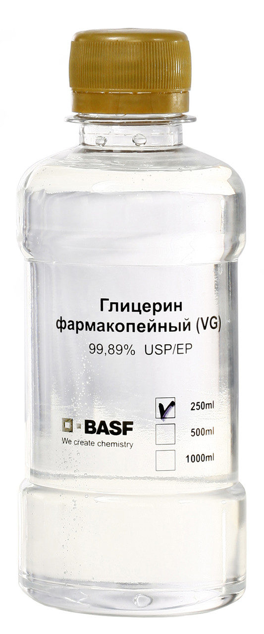 Пищевой глицерин (VG) BASF ( 250 мл) Это глицерин (E422) высокой степени очистки (99,9%), произведенный по европейским стандартам качества компанией BASF (Германия) . Подходит для пищевой и фармацевтической промышленности, в том числе и для самозамеса жидкостей для электронных сигарет .