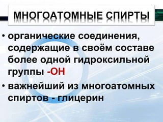 Глицерин 1 . • органические соединения, содержащие в своём составе более одной гидроксильной группы -ОН • важнейший из многоатомных спиртов - глицерин 2 . С3Н5(ОН)3 3 .