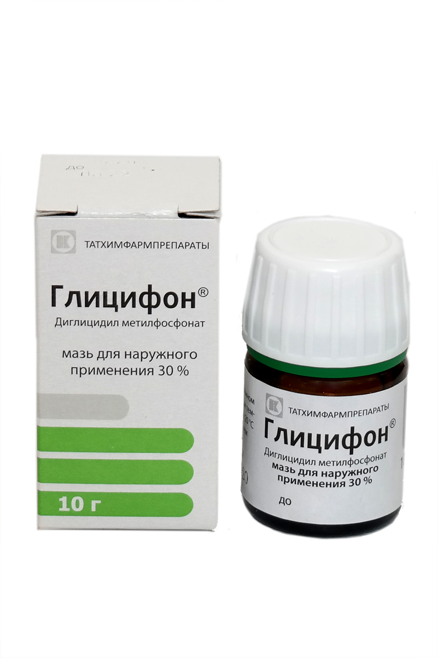 Мазь для наружного применения ди(2,3-эпоксипропиловый) эфир метилфосфоновой кислоты (глицифон) 10 г - банки стеклянные . Фармакологическое действие Оказывает цитостатическое, противоопухолевое и антисептическое действие .