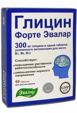 Глицин форте Эвалар 300 мг глицина в каждой таблетке, усиленного витаминами для мозга - В1, В6, В12 . Способствует повышению умственной работоспособности и нормализации сна