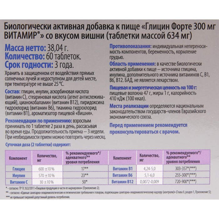 Купить Витамир Глицин форте таблетки 300 мг вишня, 60 шт . в интернет-аптеке в Москве, низкие цены и официальная инструкция по применению, честные отзывы покупателей и фармацевтов о Витамир Глицин форте таблетки 300 мг вишня, 60 шт . .