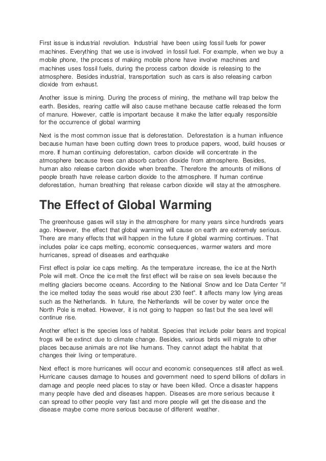 Every paragraph on global warming essays should explain a different point . Conclusion: After bringing out your argument cohesively, the conclusion allows you to tie the points neatly . You should summarize the entire essay in a few sentences . Note that the conclusion should not introduce new points .