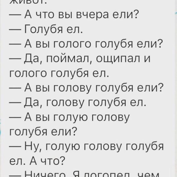 - Голубя ел . - А вы голого голубя ели? - Да, поймал, ощипал и голого голубя ел . - А вы голову голубя ели? - Да, голову голубя ел . - А вы голую голову голубя ели? - Ну, голую голову голубя ел . А что . . .