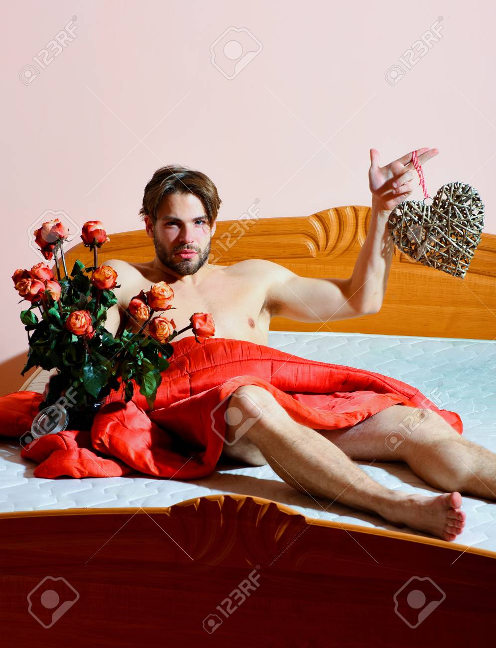 Скачайте стоковую фотографию Красивый бородатый сексуальный мужчина-мачо со стильной бородой, сидящий голый на кровати под красным одеялом, держа букет оранжевых роз и декоративное валентинное сердце с мышечным . . .