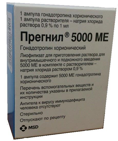 Активное вещество: гонадотропин хорионический Форма выпуска, состав и упаковка лиоф . порошок д/пригот . р-ра д/инъекц . 5000 МЕ: фл . 1 шт . в комплекте с растворителем 1 мл амп . 1 шт . Рег . №: 9806/11 от 04 .10 .2011 - Действующее