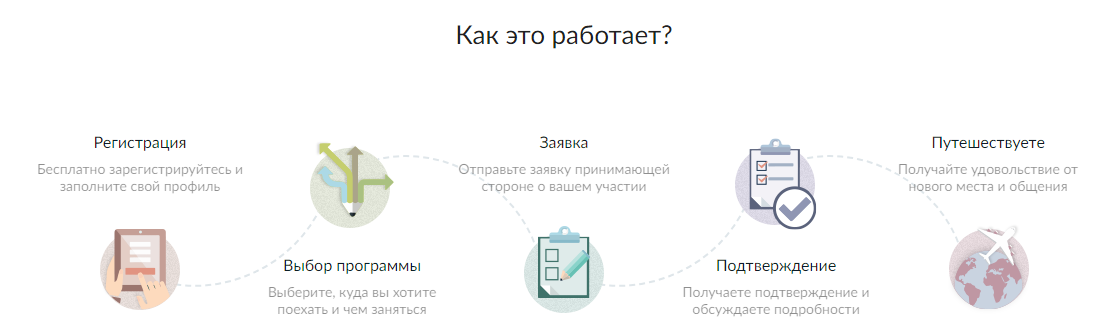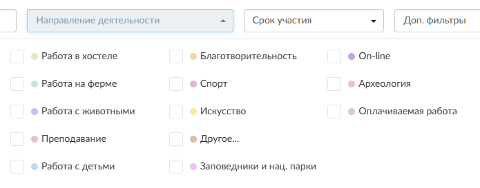 Чаще всего предлагают проекты с проживанием и питанием в обмен на твой труд и помощь. Дату и направление деятельности можно выбрать используя фильтры.