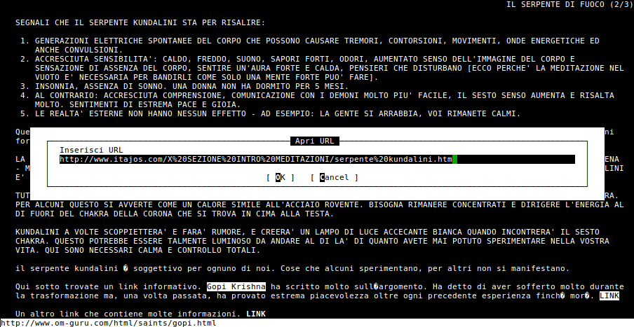 Rileggendo alcune pagine di JoS, mi sono imbattuto in questa: Il Serpente di Fuoco. Non che non la avessi mai letta, principalmente elenca alcuni "sintomi" dell'attivazione del Kundalini. Quello a cui non ho mai fatto caso però è che in questa pagina venisse menzionato Gopi Krishna. Apparentemente costui ha risvegliato il Kundalini senza però avere tutta la conoscenza necessaria prima del processo. Il serpente è risalito in Gopi non attraverso il Sushumna, ma attraverso uno dei nadi.