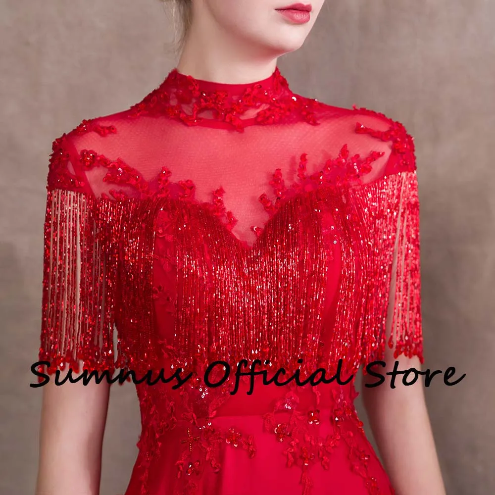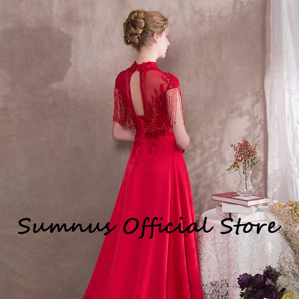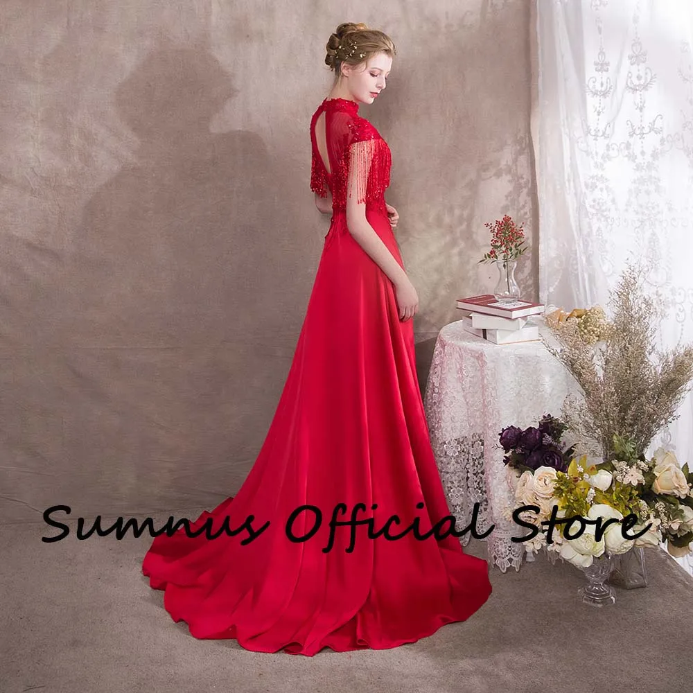 OIyneqmSpLLooked for Gorgeous Red Tassel Evening Dresses High Neck Soft Satin Appliques A Line Dinner Dress Robe de Bal 2022 Evening Gown With Train for a long time, but could not find it? Bring to your attention Gorgeous Red Tassel Evening Dresses High Neck Soft Satin Appliques A Line Dinner Dress Robe de Bal 2022 Evening Gown With Train with the best price!