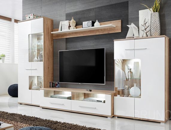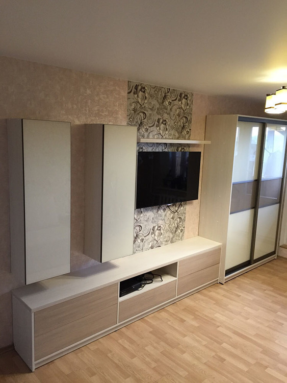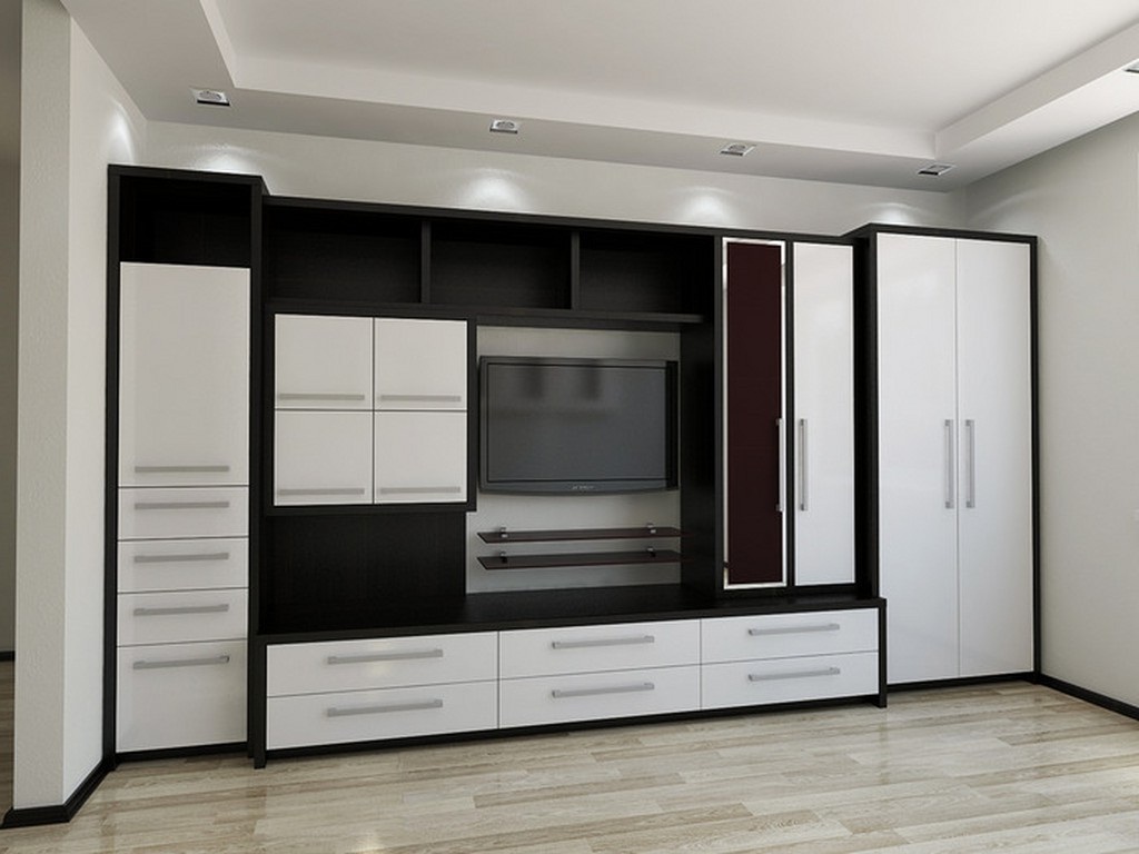 Фото галерея стенок со шкафом для одежды и нишей под ТВ Материалы корпуса . Рассмотрим материалы, из которых производят стенки в гостиную в современной стилистике: