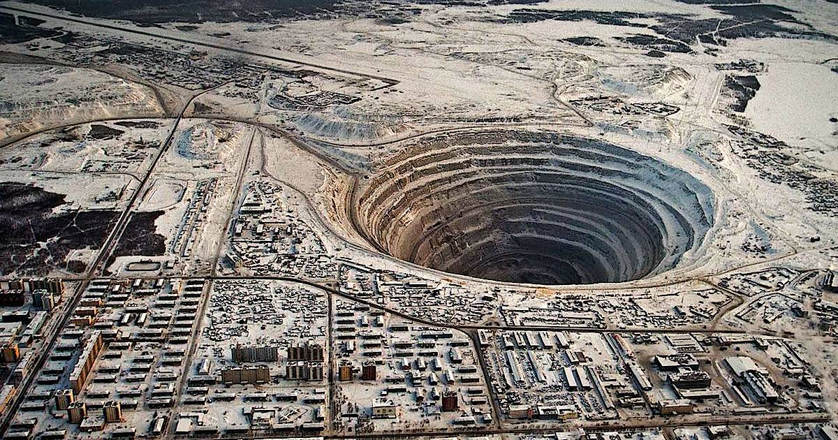 Город Мирный . Статус города рабочий посёлок получил в 1959 году . Производство алмазов открытым способом здесь производилось до 2001 года .