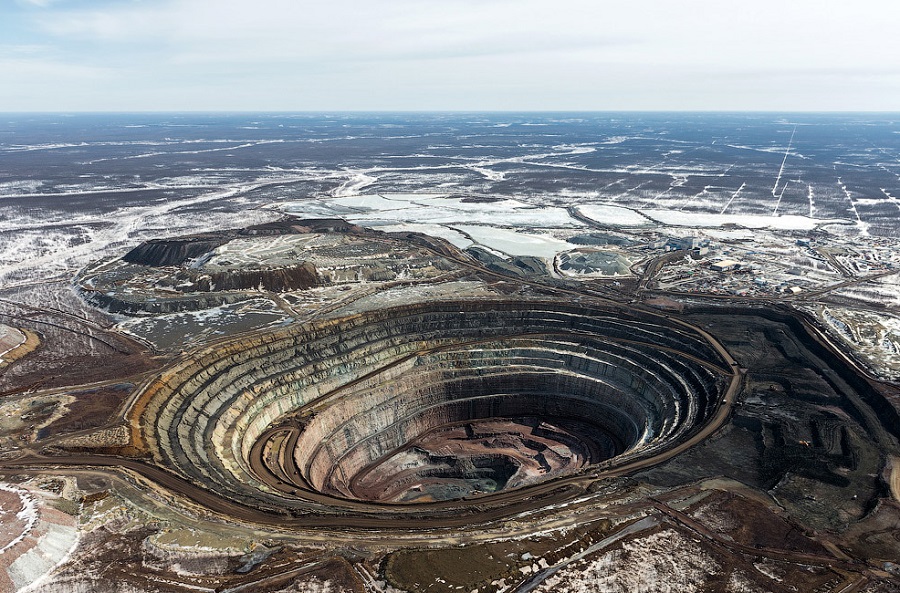 Карьер «Мир» в Якутии — блеск алмазов в царстве вечной мерзлоты В городе Мирный, в Якутии находится один из крупнейших в мире алмазных карьеров — кимберлитовая трубка «Мир» . Над алмазоносной шахтой не летают вертолёты: гигантская воронка глубиной 525 метров и диаметром более 1 километра, инициируя восходящие потоки, засасывает летательные аппараты .