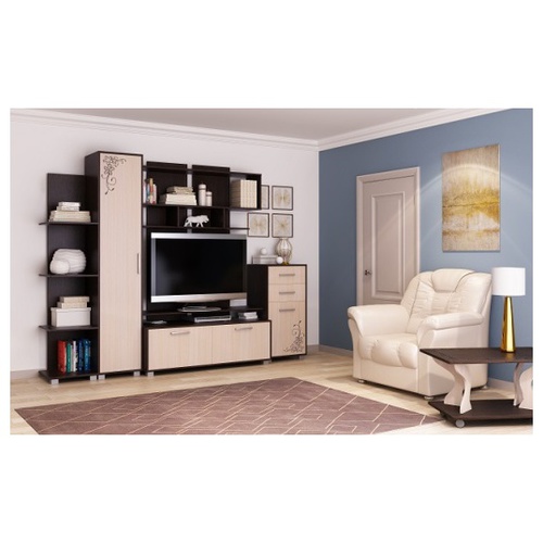 Стиль 2 . Вернуться к: Гостиные . Под телевизор предусмотрен полочный модуль с опорой на панель-основание с двумя полками и шкафчиком . Эта модель обладает не только доступностью, но и прекрасным качеством, данный набор относится именно к такой мебели .