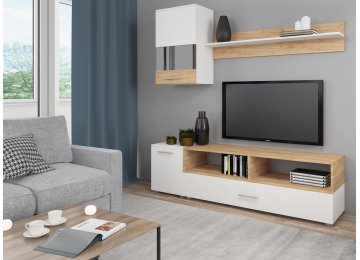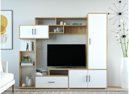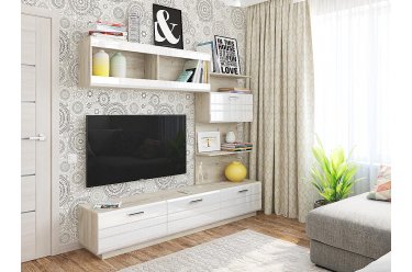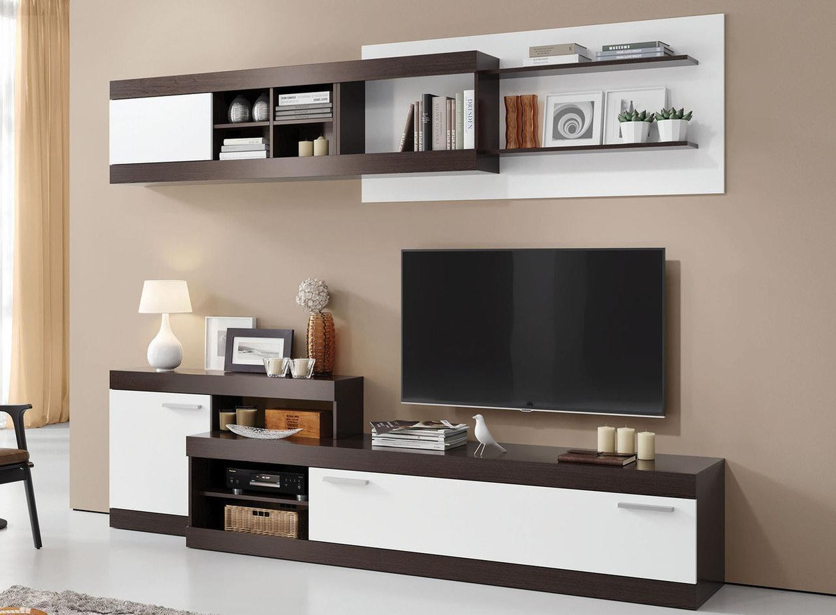 Но в любом случае готовая стенка выглядит достаточно цельной . Правда, модульная гостиная со шкафом, точнее ее тумба, преимущественно идет без задней планки .