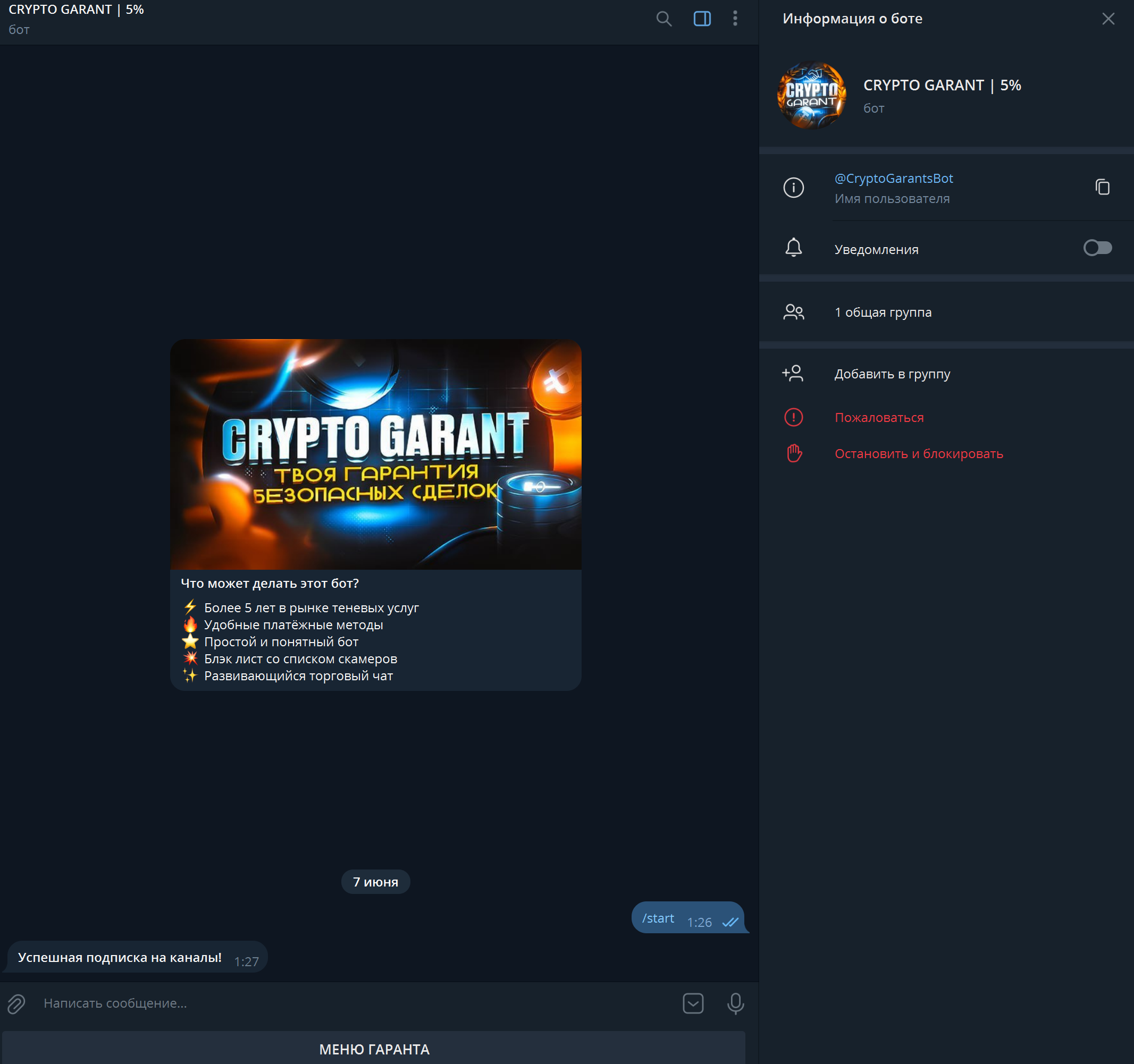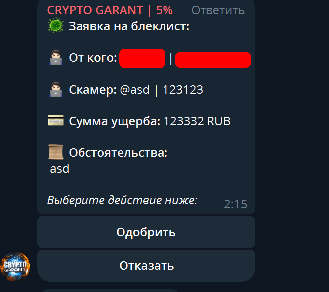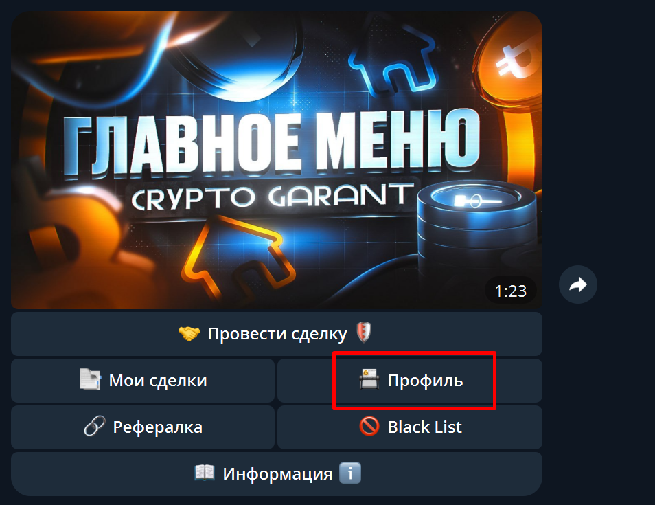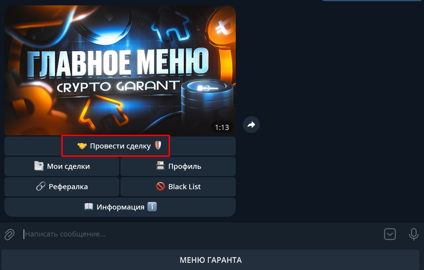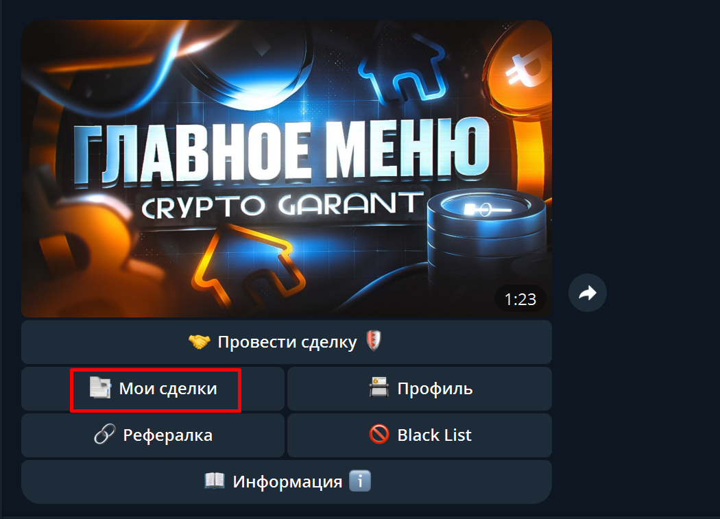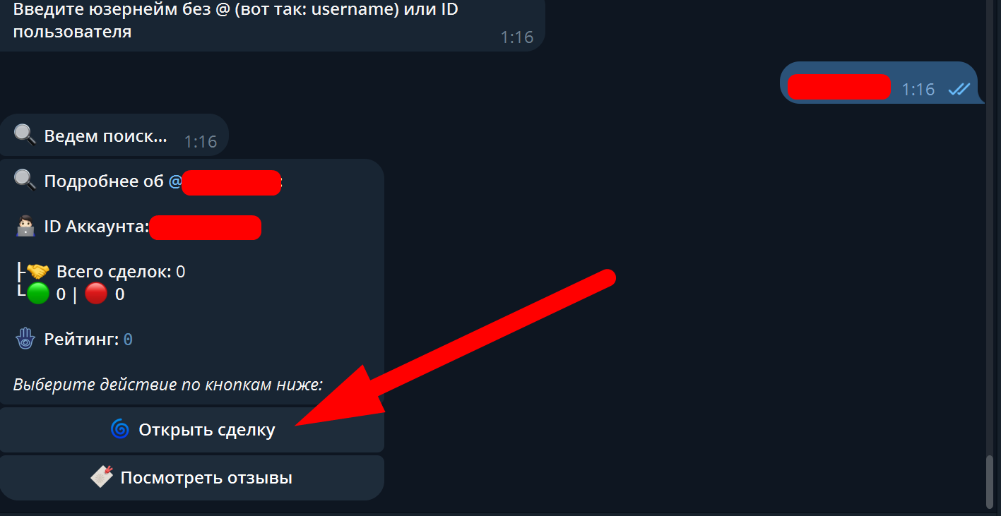 Необходимо нажать кнопку "Провести сделку", затем в новом появившемся окне ввести юзернейм человека без @, после чего вам станет доступна информация о нём исходя из информации в нашем гарант сервисе.