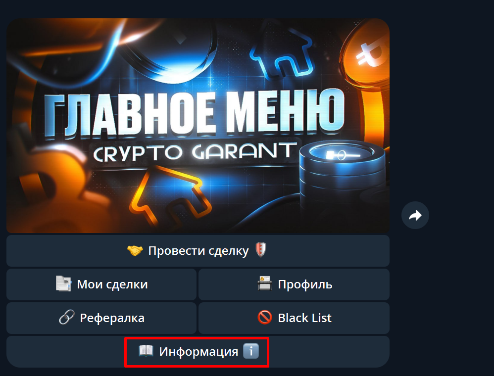 Кнопка "Информация" - содержит в себе ссылку на торговый чат, если вы хотите пригласить к нам друга, так-же правила гарант сервиса, и эту самую инструкцию, которую вы сейчас читаете.