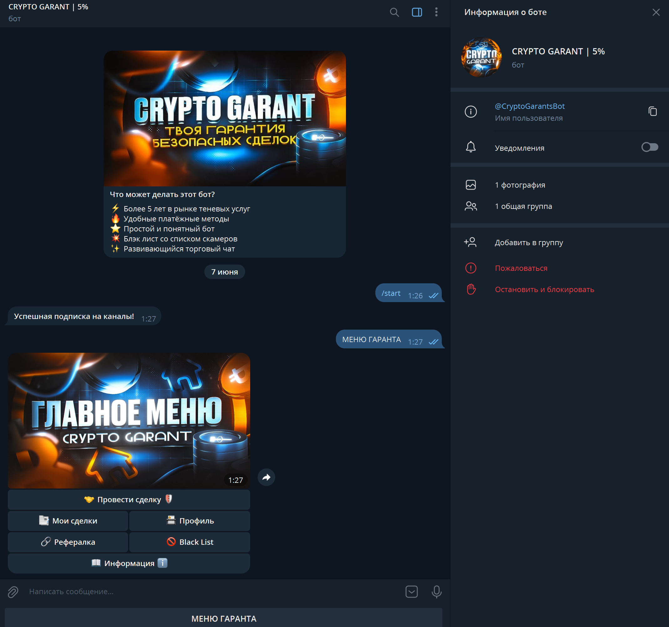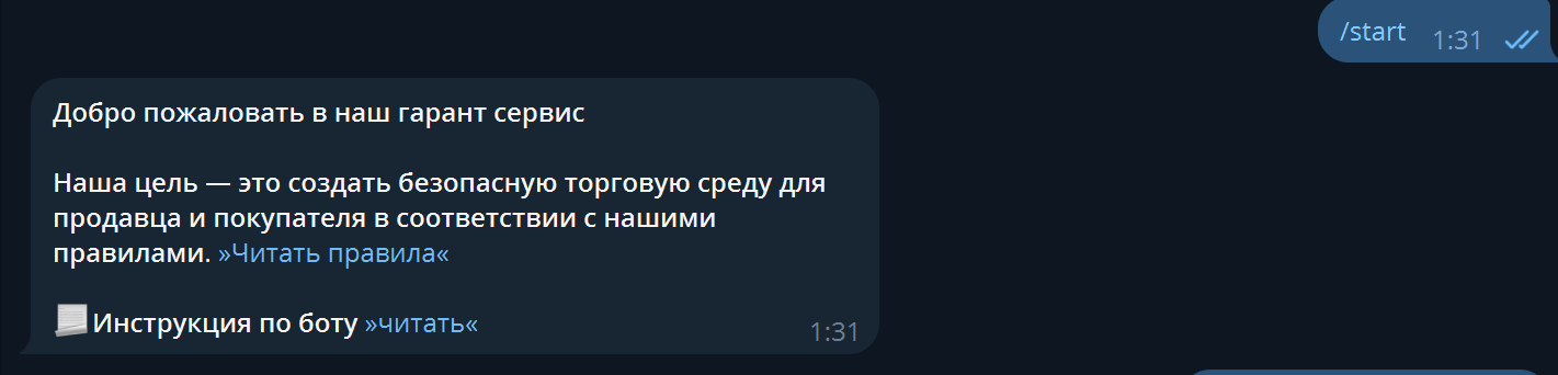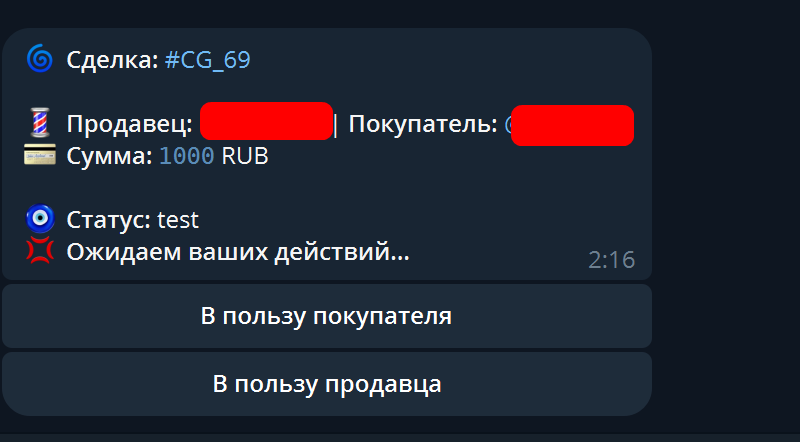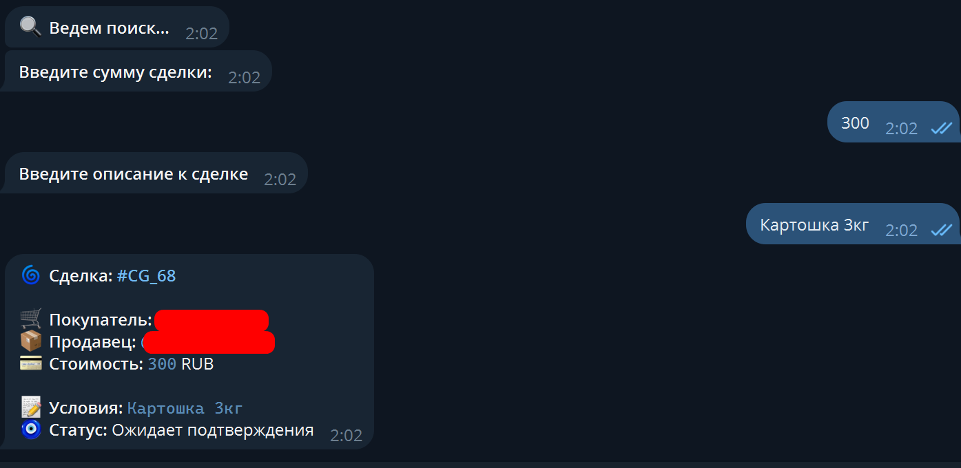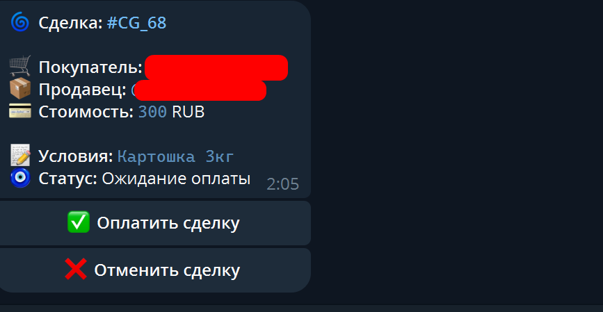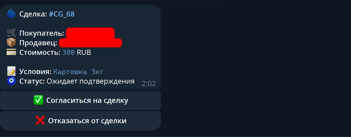 Затем описание сделки - будьте максимально подробны, опишите как можно больше деталей, чтобы в случае любых разбирательств арбитраж был решён в вашу сторону, в случае неправоты второй стороны сделки. Если описание вашей сделки содержит слишком много текста, то можете оформить его через @telegraph. Главное - всё максимально подробно и детально.
