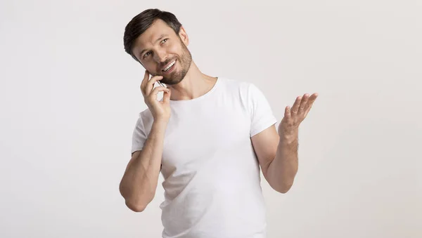 говорящий человек . . . . Счастливый человек в солнцезащитных очках и рубашке для поло записывает голосовое сообщение на мобильный телефон снаружи . . . cтоковые фото, . . .