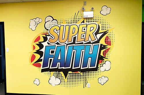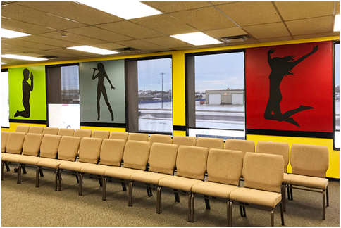 This image is from our own Edmonton office! We really liked the idea of leading a viewer “inward” with imagery. Applied to a door, this pleasant scene of a gently winding road is highly effective. The door is set back from its frame and lends a sense of depth, which is very effective in wall murals. You’re tempted to open the door just to see where it leads!