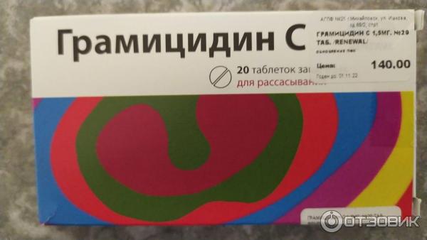 таблетки для рассасывания . Состав . Каждая таблетка содержит Грамицидина С - 1,5 мг . Упаковка . 20 шт . Фармакологическое действие . Грамицидин С - антибактериальный препарат для местного применения в полости рта и глотки . Оказывает выраженное противомикробное действие .