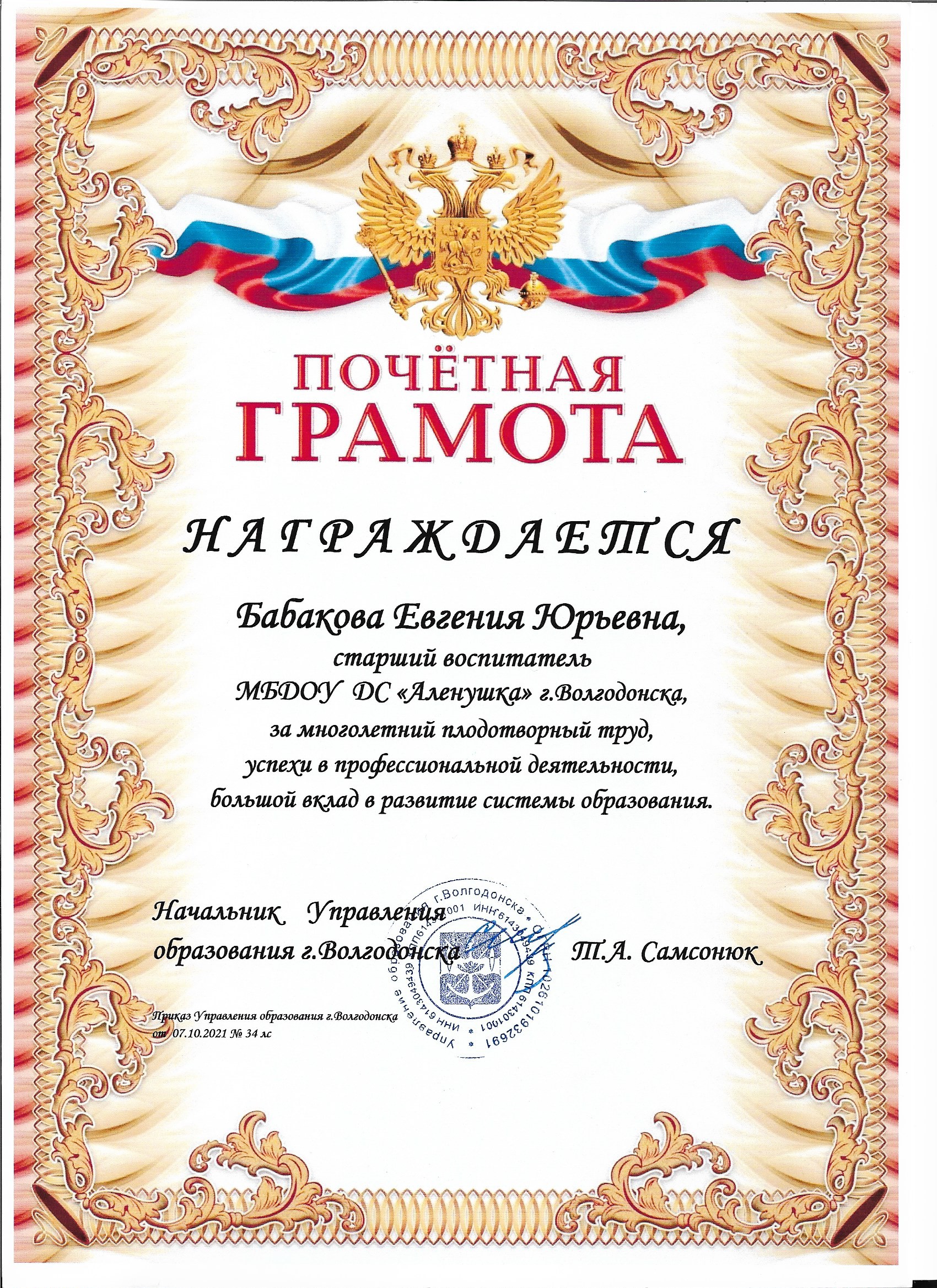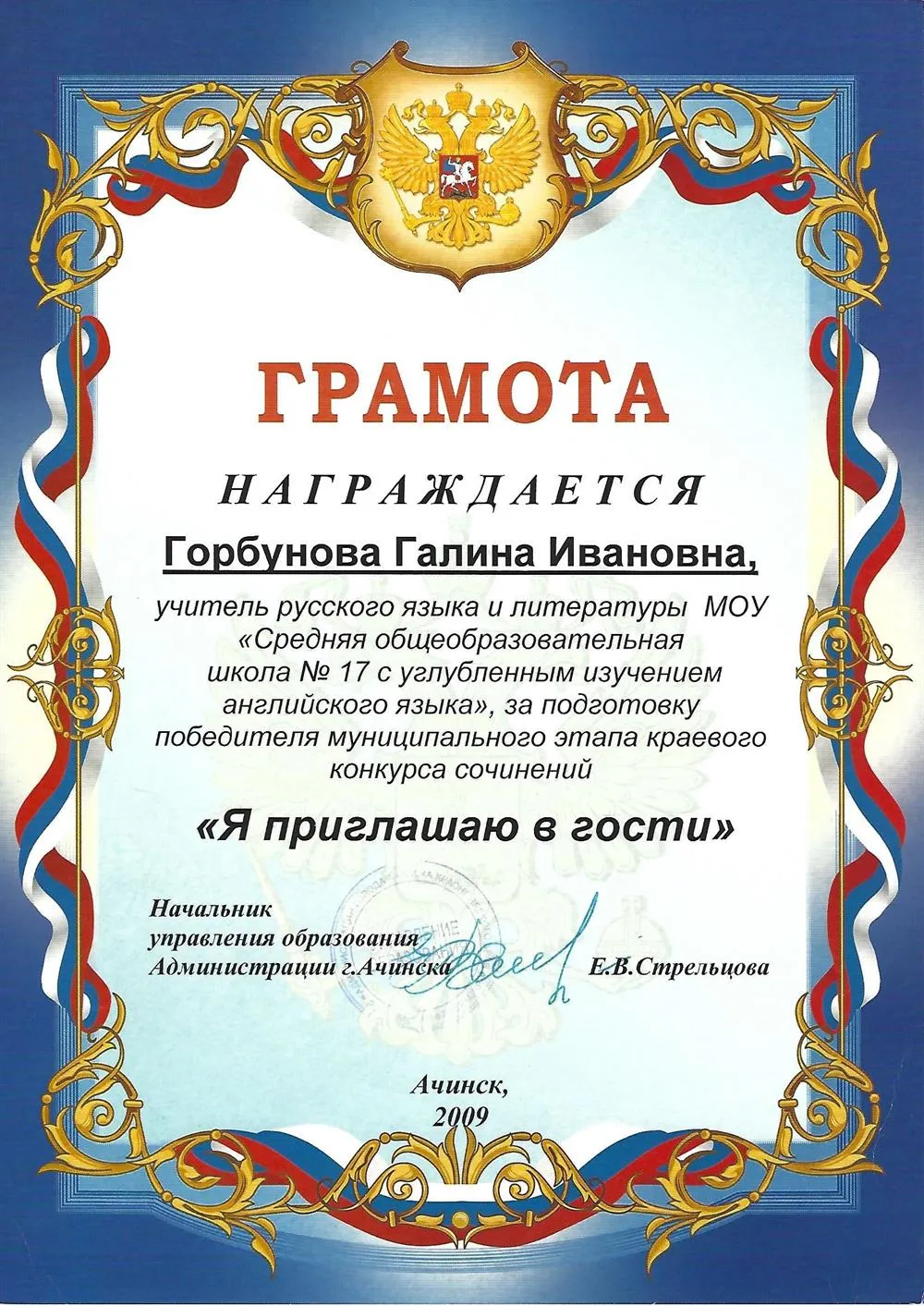 Грамота работнику школы