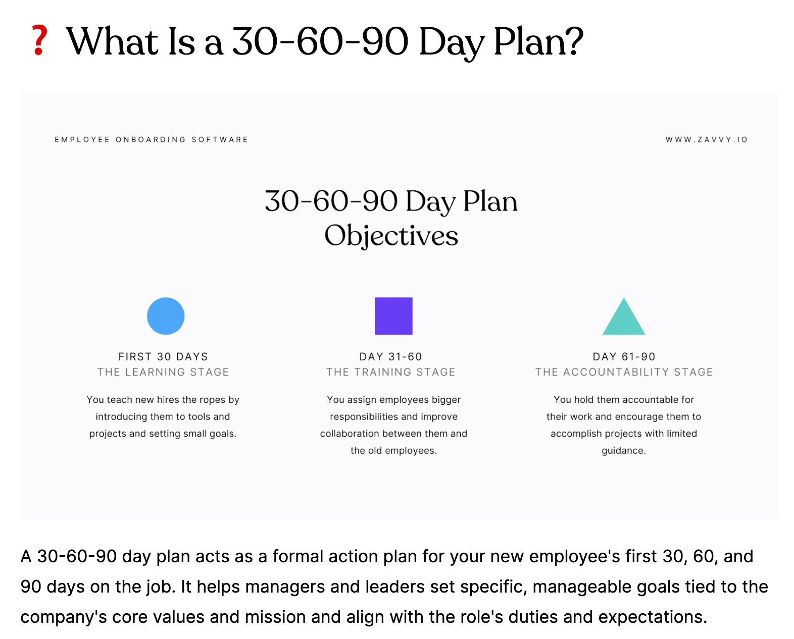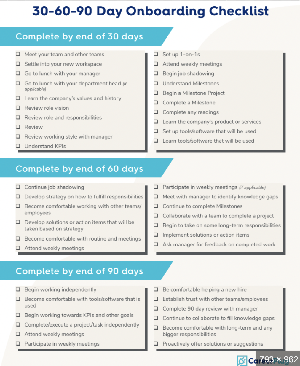 - Общий роадмэп всех 90 дней онбординга (что будет происходить, что вы ожидаете от сотрудника, а что вы сами дадите ему)