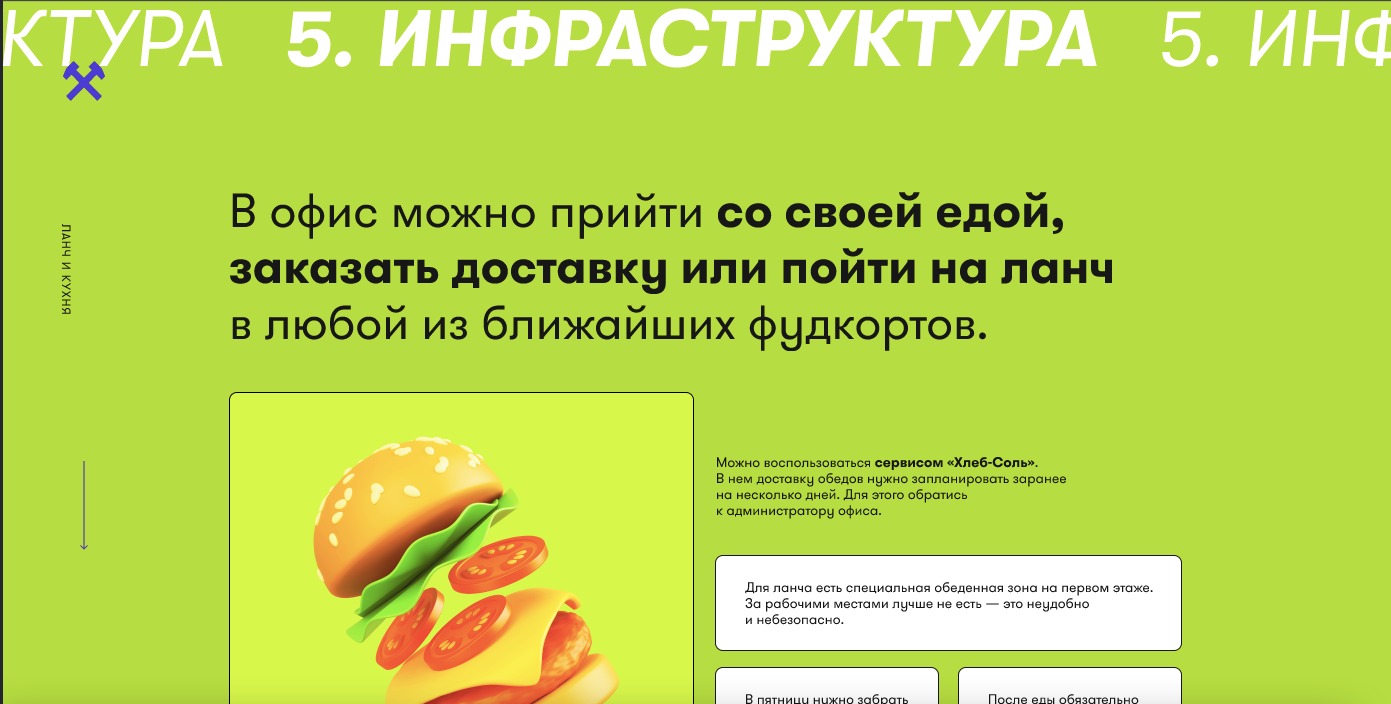 В процессе адаптации новых сотрудников мы поняли, что бесконечные инструкции в почте не работают. Поэтому мы создали собственный внутренний портал. Это яркий и удобный сайт, на котором есть вся необходимая информация. С помощью него новый сотрудник может узнать про ценности, миссию компании, наш быт и особенности корпоративной культуры, познакомиться с сотрудниками и изучить их зону ответсвенности, воспользоваться инструкциями для внутренних процессов, а также получить рекомендации, куда сходить на ланч.