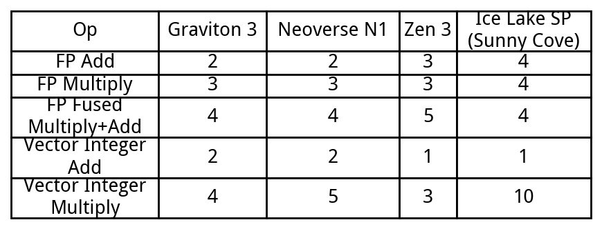 Graviton 3 also inherits Neoverse N1’s vector and floating point execution latencies, except for slightly dropping integer multiply latency.