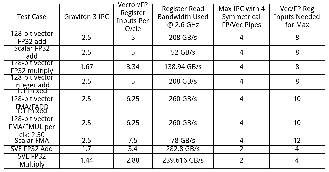 In terms of execution throughput, Graviton 3 probably has four 128-bit vector/FP pipes, since it’s able to do more than one SVE instruction per cycle for all of the operations (FP add, FP multiply, integer add) we tested. Theoretically, this would let Graviton 3 achieve impressive throughput for NEON and scalar FP operations, but we weren’t able to exceed three instruction per cycle throughput for NEON FP add/multiply and integer adds. This could be explained by a register file bandwidth limitation, in terms of inputs per cycle needed.