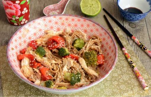 Гречневая лапша или соба с овощами и курицей