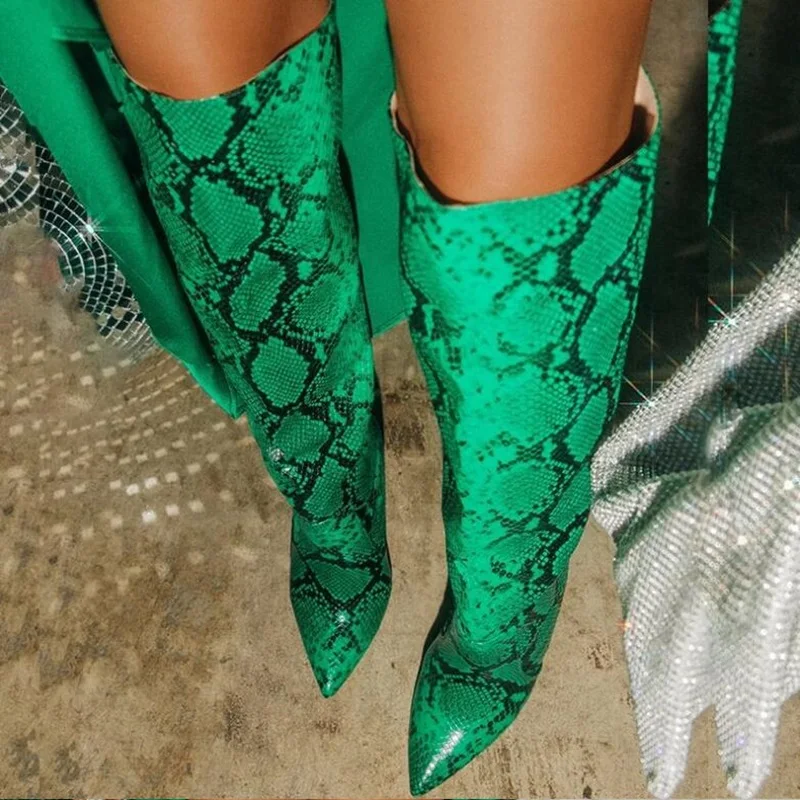 sjNyYUitbHere you can buy Green Snakeskin Leather Knee High Boots Python Pattern Pointed Toe Cover Thin Heels Long Boots Plus Size 43 with free delivery to your post office.